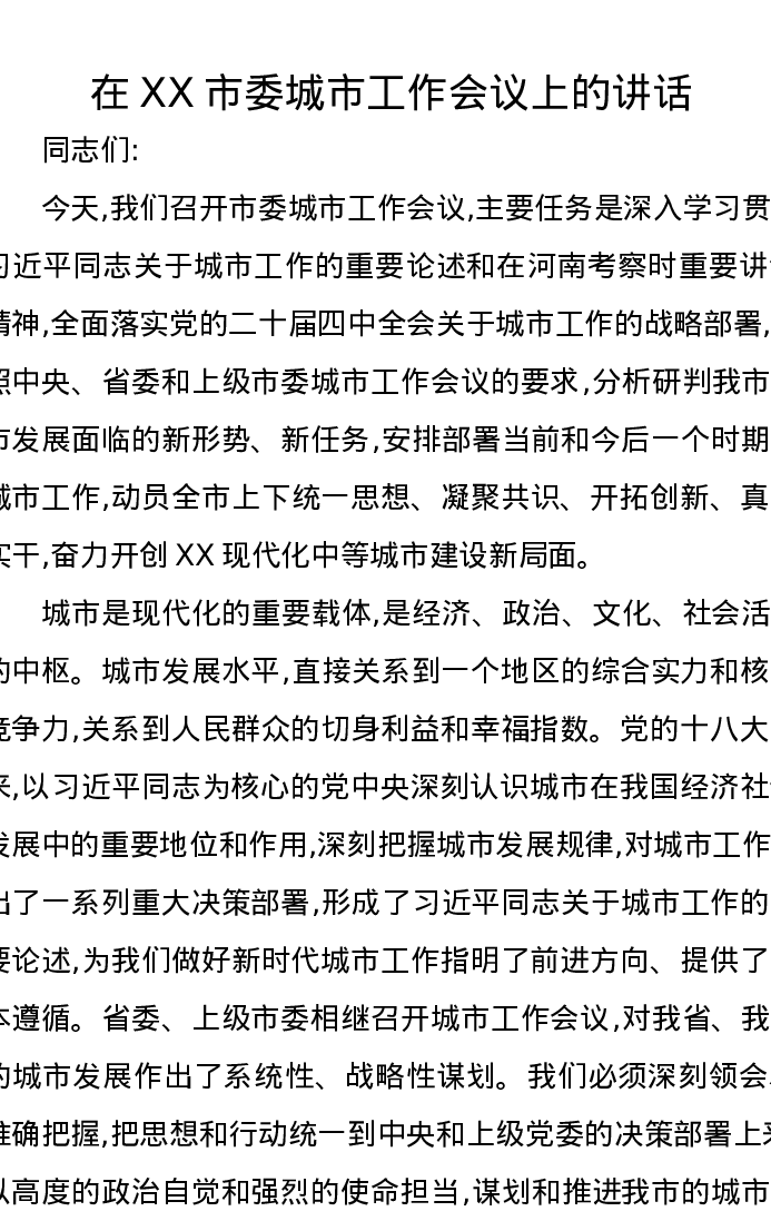 在XX市委城市工作会议上的讲话-1