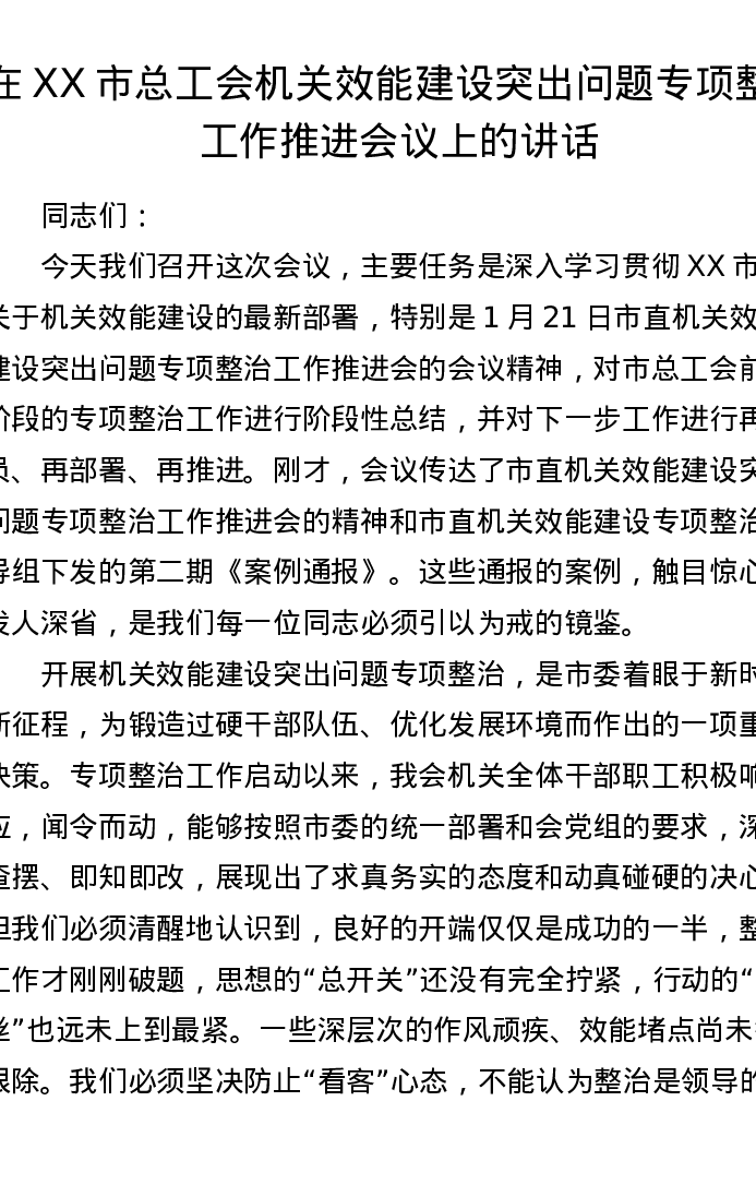 在XX市总工会机关效能建设突出问题专项整治工作推进会议上的讲话