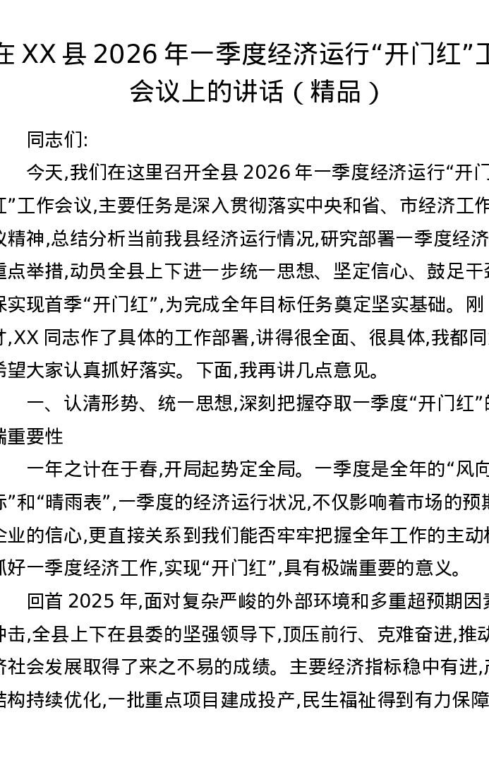 在XX县2026年一季度经济运行开门红工作会议上的讲话
