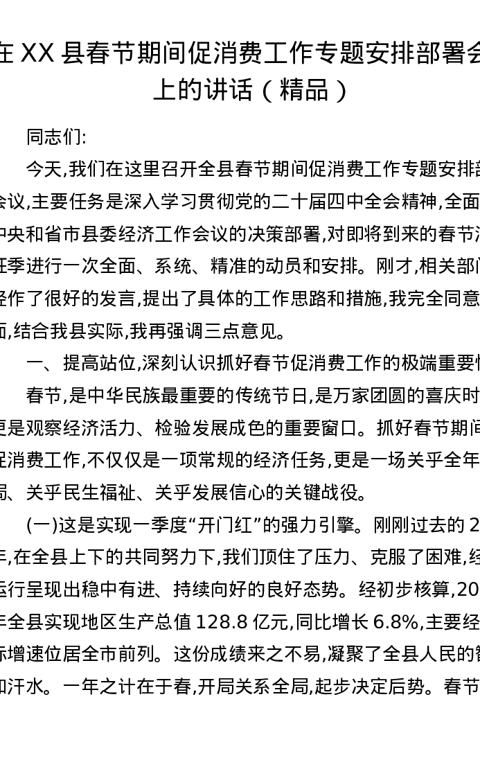 在XX县春节期间促消费工作专题安排部署会议上的讲话