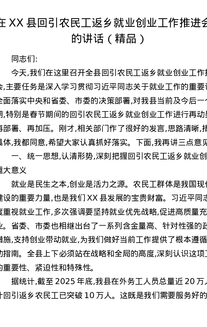 在XX县回引农民工返乡就业创业工作推进会上的讲话