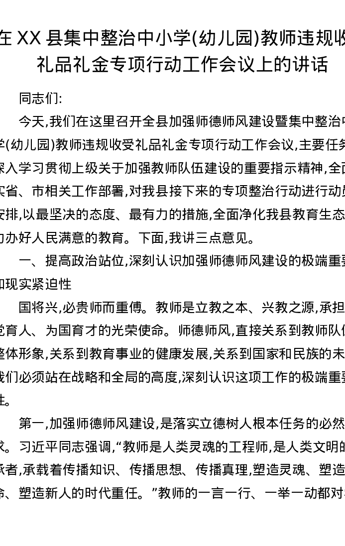 在XX县集中整治中小学(幼儿园)教师违规收受礼品礼金专项行动工作会议上的讲话