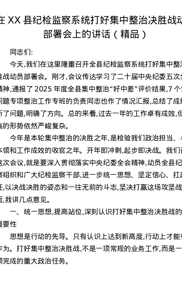 在XX县纪检监察系统打好集中整治决胜战动员部署会上的讲话
