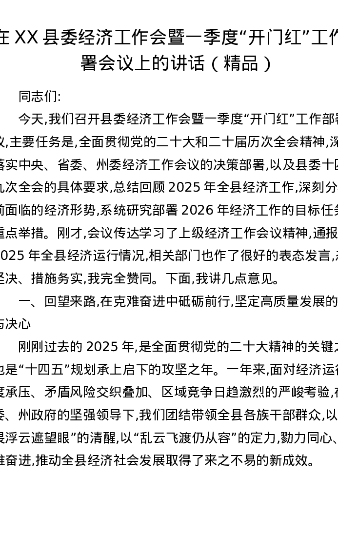 在XX县委经济工作会暨一季度开门红工作部署会议上的讲话