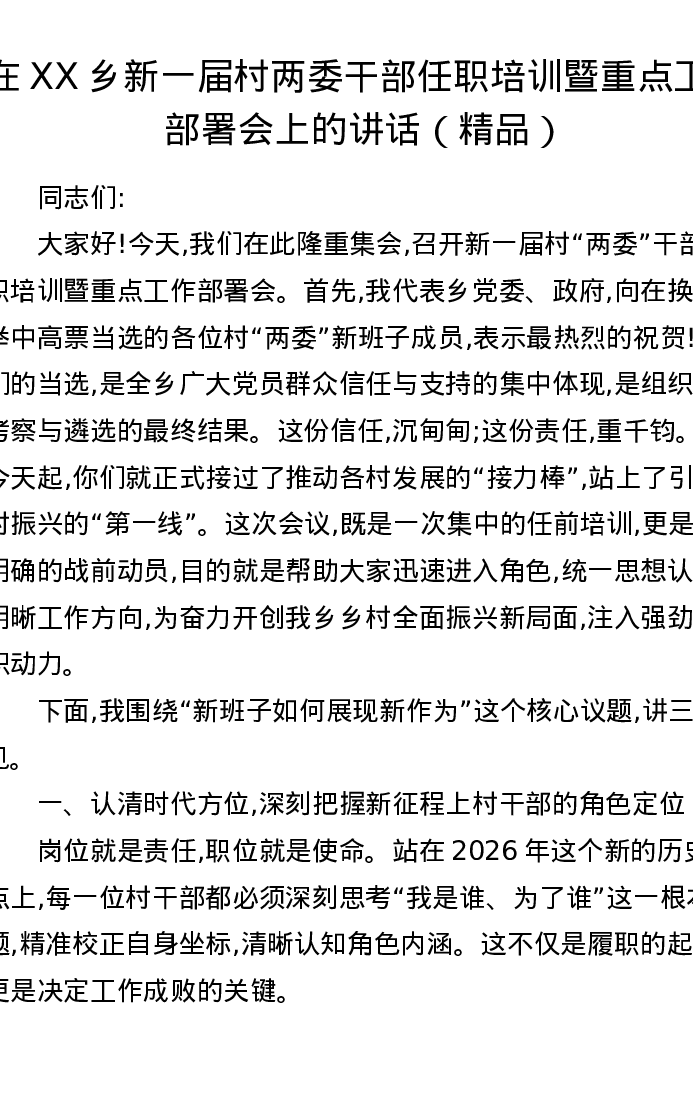 在XX乡新一届村两委干部任职培训暨重点工作部署会上的讲话