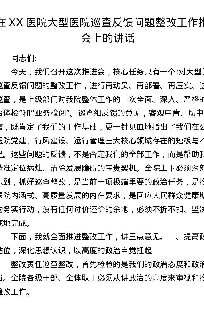 在XX医院大型医院巡查反馈问题整改工作推进会上的讲话