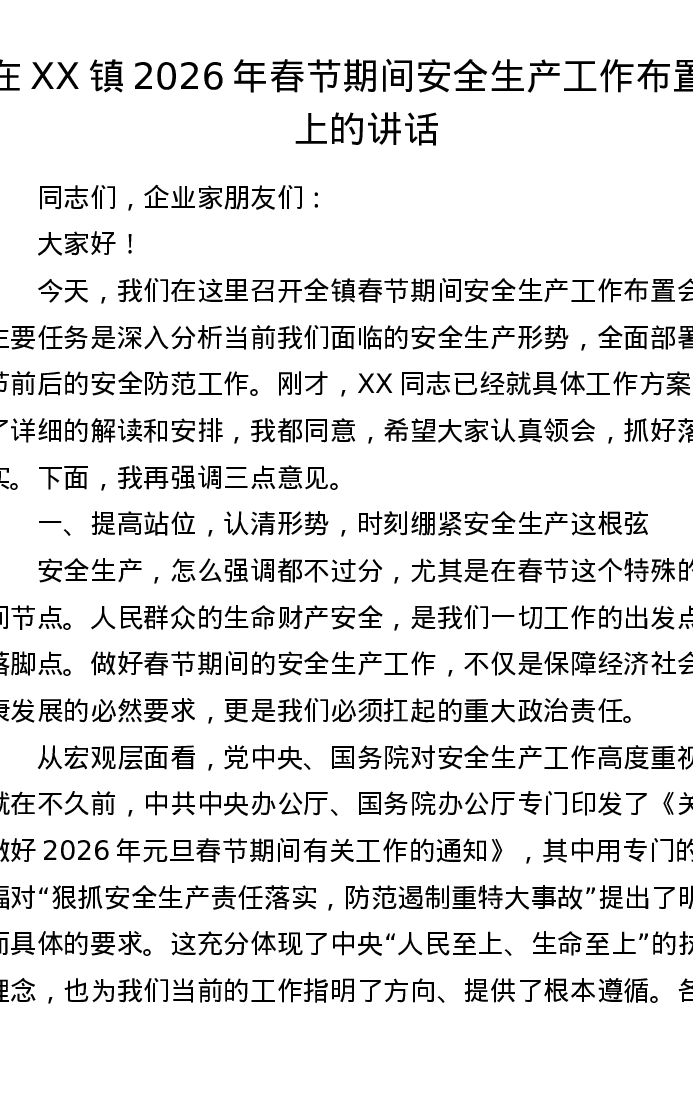 在XX镇2026年春节期间安全生产工作布置会上的讲话
