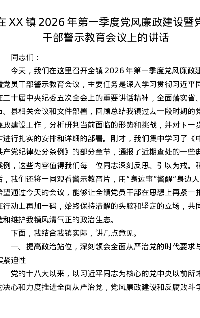 在XX镇2026年第一季度党风廉政建设暨党员干部警示教育会议上的讲话