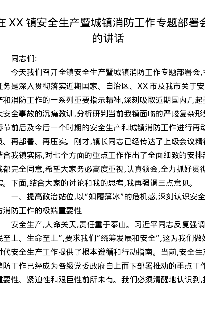 在XX镇安全生产暨城镇消防工作专题部署会上的讲话