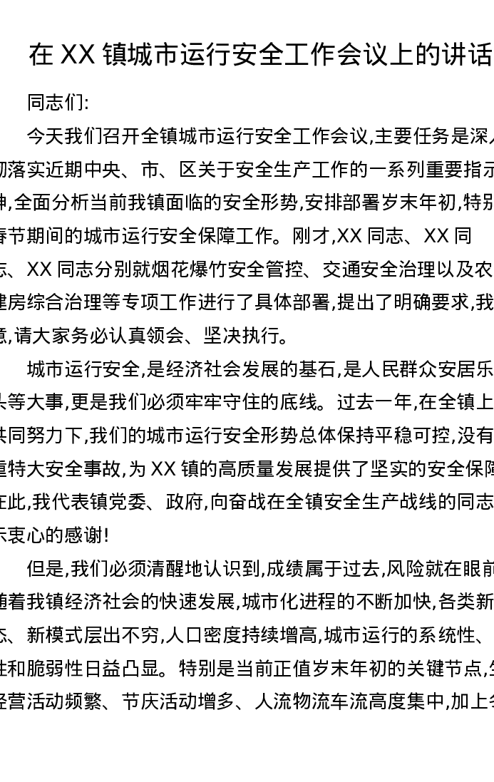 在XX镇城市运行安全工作会议上的讲话