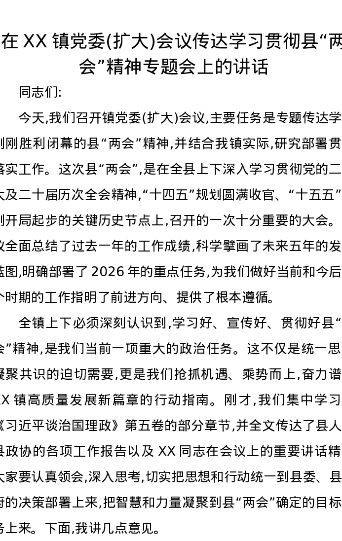 在XX镇党委(扩大)会议传达学习贯彻县两会精神专题会上的讲话