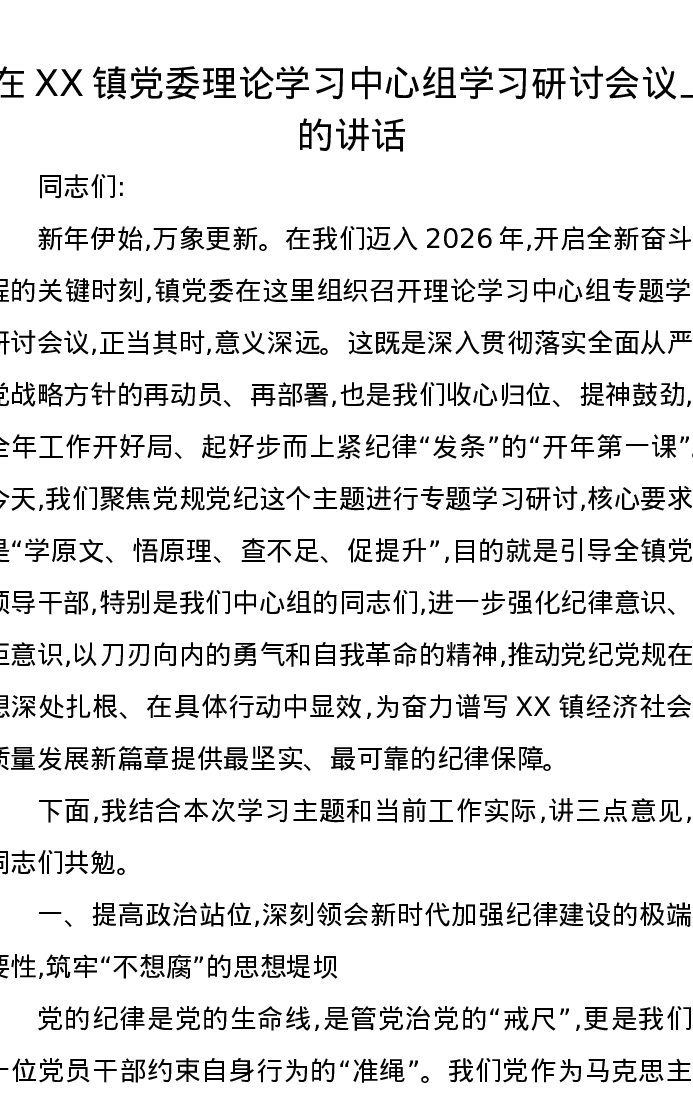在XX镇党委理论学习中心组学习研讨会议上的讲话