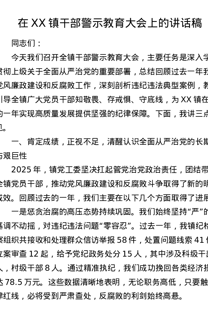 在XX镇干部警示教育大会上的讲话稿