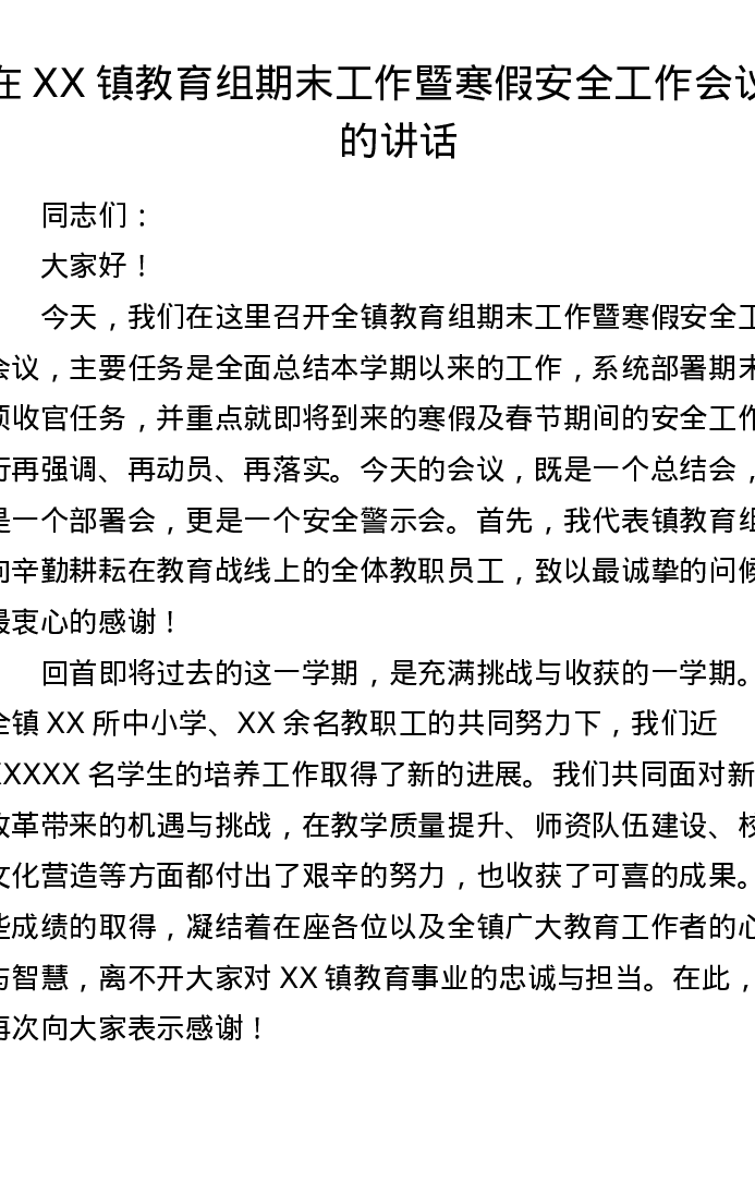 在XX镇教育组期末工作暨寒假安全工作会议上的讲话