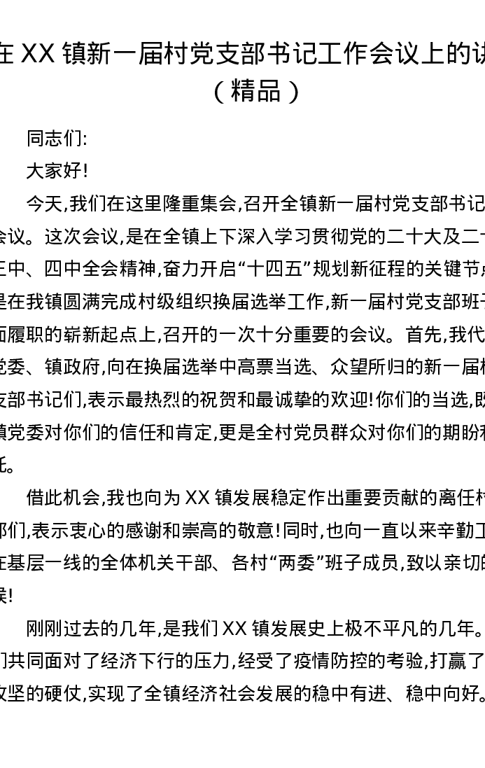 在XX镇新一届村党支部书记工作会议上的讲话
