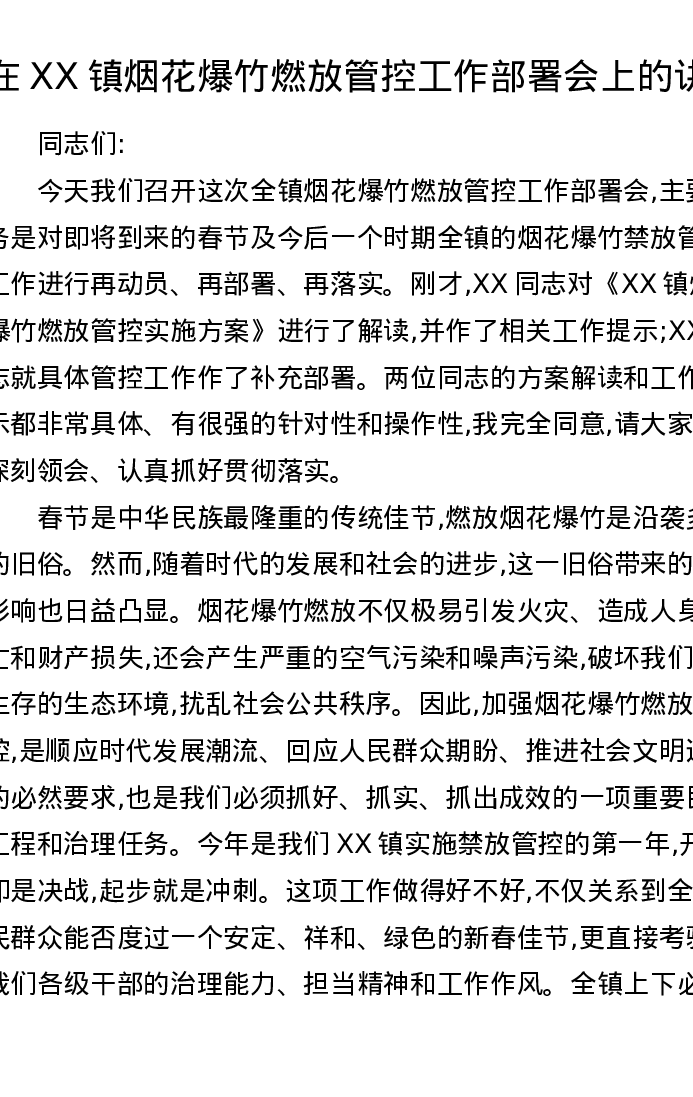 在XX镇烟花爆竹燃放管控工作部署会上的讲话