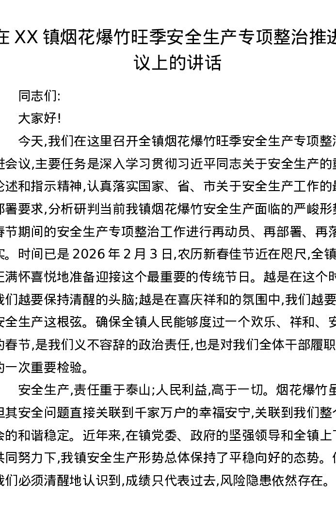 在XX镇烟花爆竹旺季安全生产专项整治推进会议上的讲话