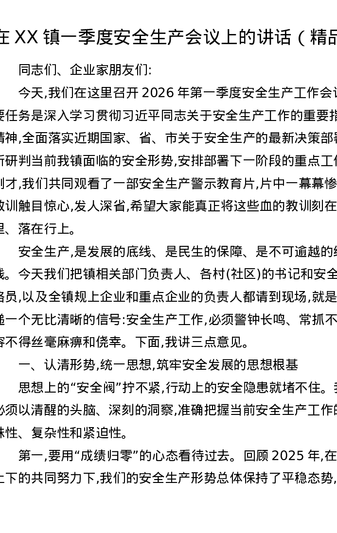 在XX镇一季度安全生产会议上的讲话