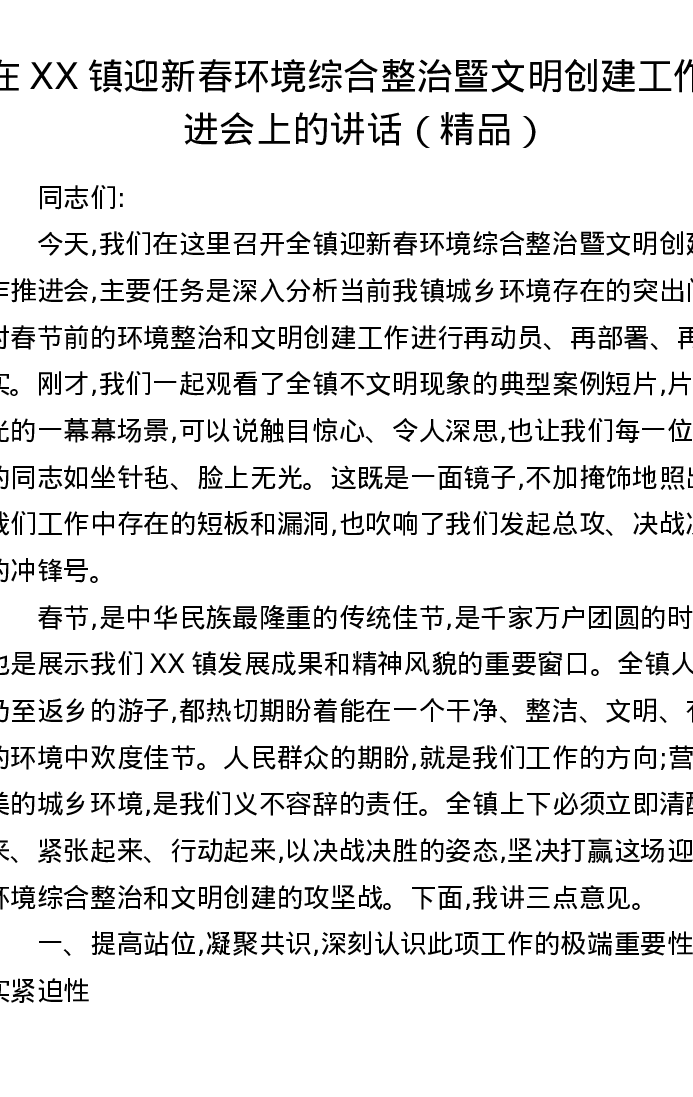 在XX镇迎新春环境综合整治暨文明创建工作推进会上的讲话