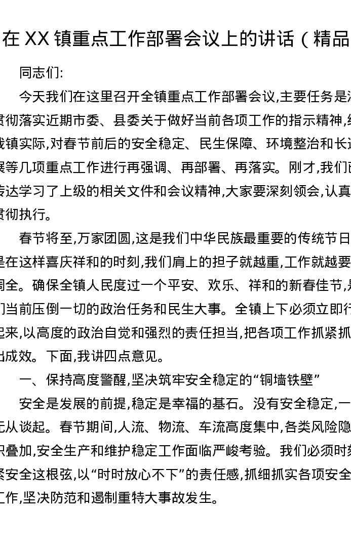 在XX镇重点工作部署会议上的讲话