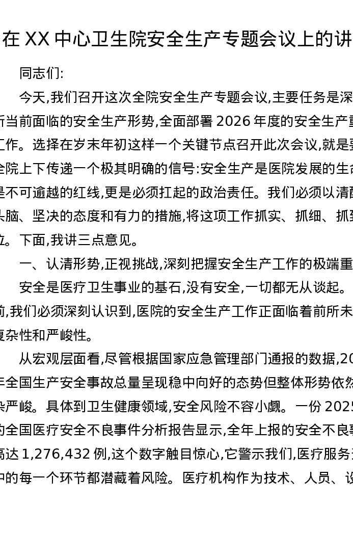 在XX中心卫生院安全生产专题会议上的讲话