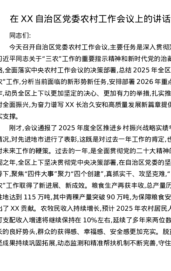 在XX自治区党委农村工作会议上的讲话