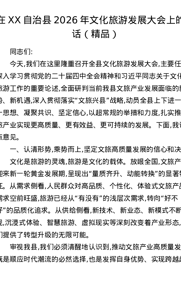 在XX自治县2026年文化旅游发展大会上的讲话