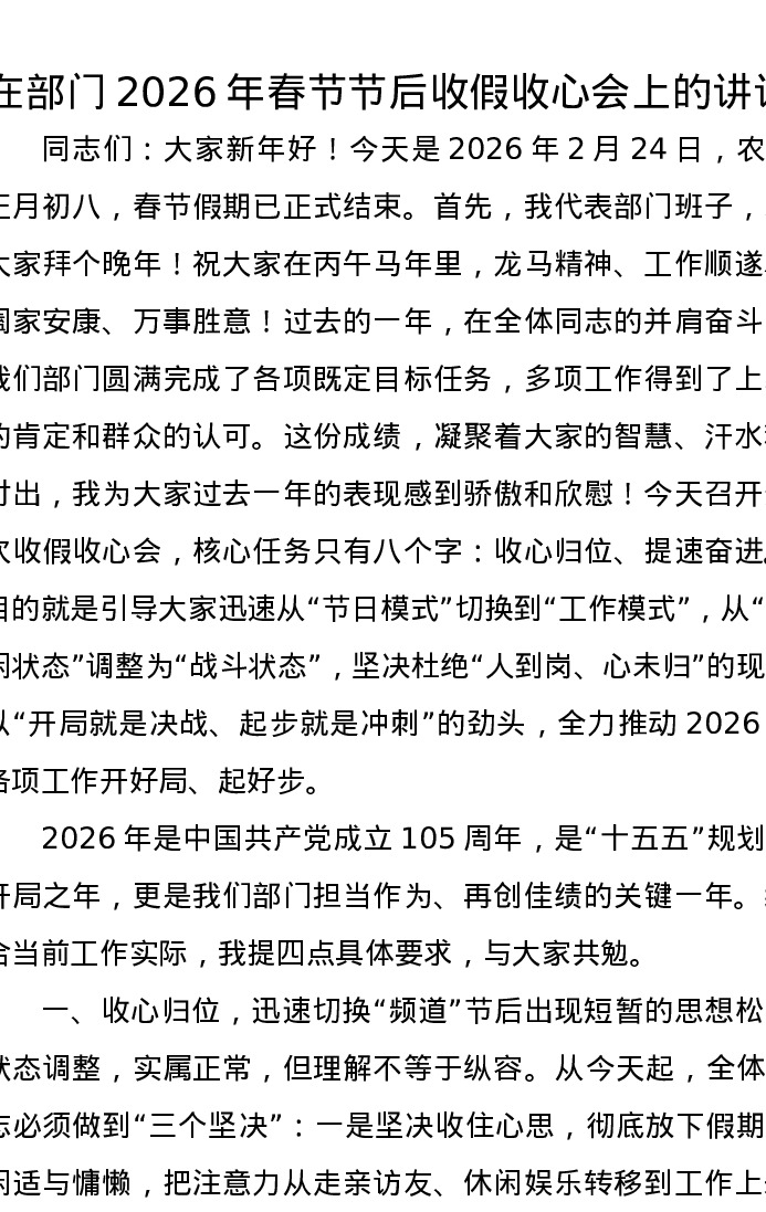 在部门2026年春节节后收假收心会上的讲话