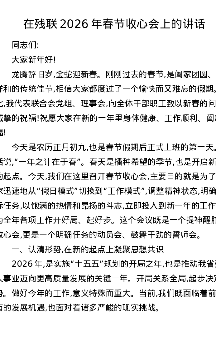 在残联2026年春节收心会上的讲话