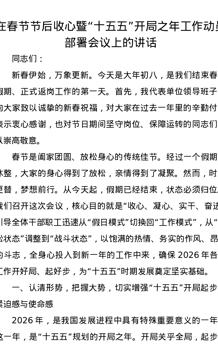 在春节节后收心暨十五五开局之年工作动员部署会议上的讲话
