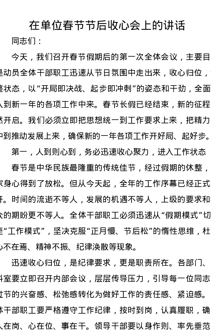 在单位春节节后收心会上的讲话