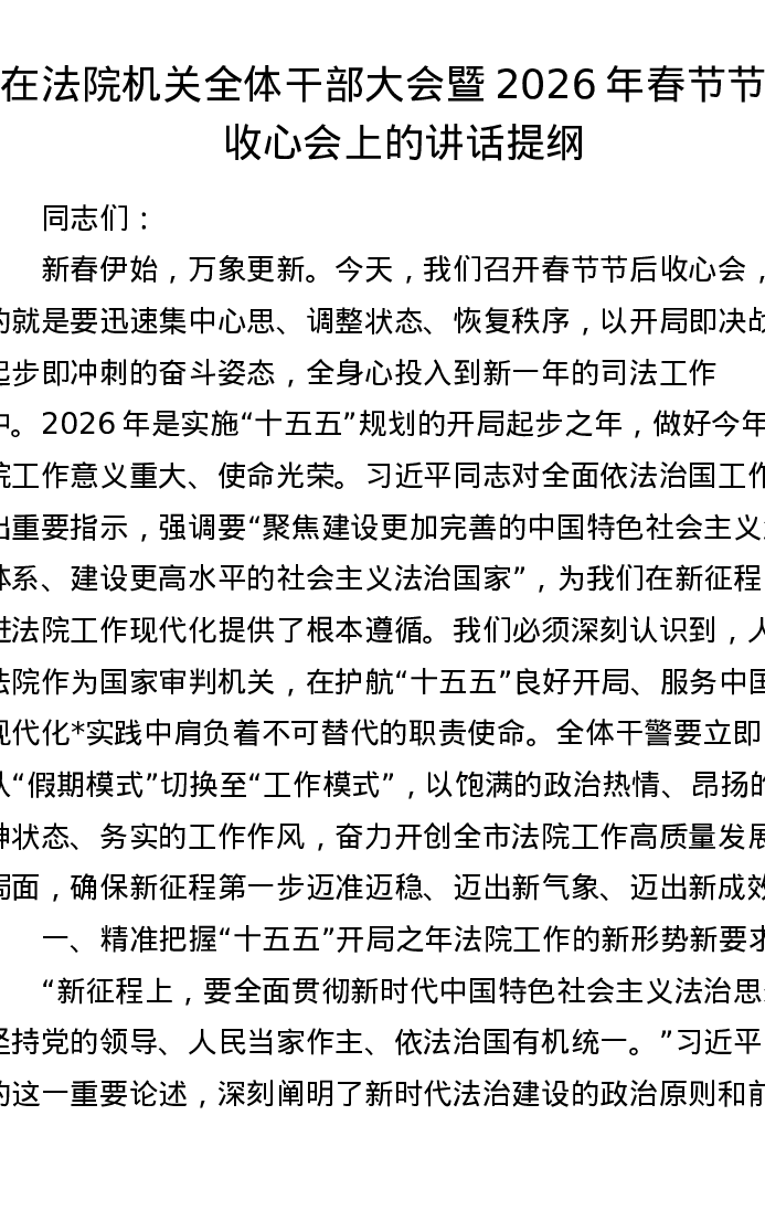 在法院机关全体干部大会暨2026年春节节后收心会上的讲话提纲