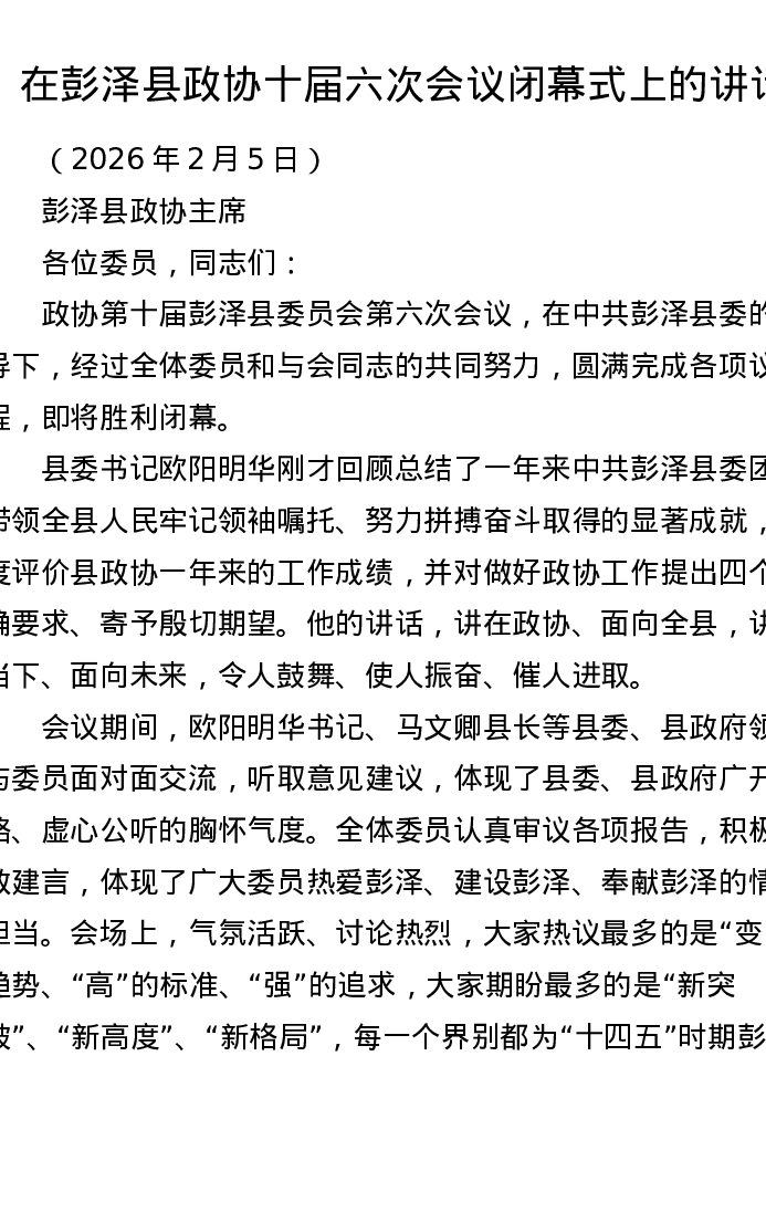 在彭泽县政协十届六次会议闭幕式上的讲话