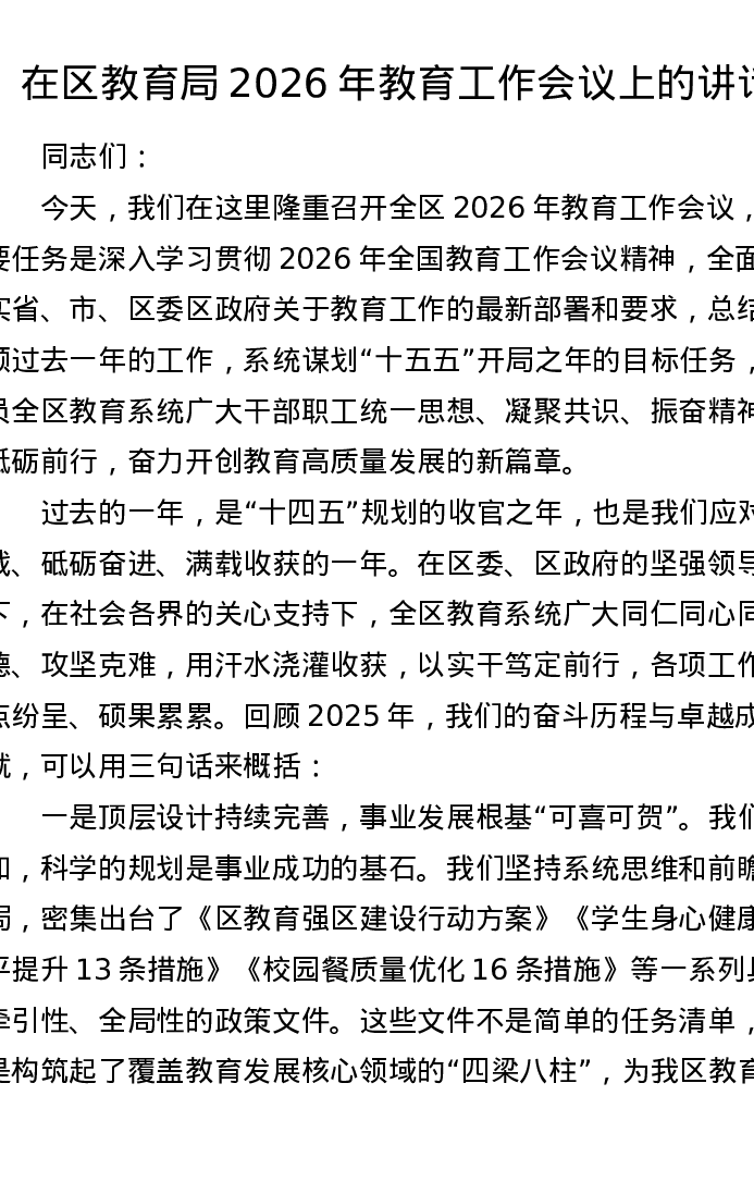 在区教育局2026年教育工作会议上的讲话