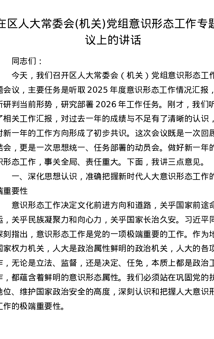 在区人大常委会(机关)党组意识形态工作专题会议上的讲话