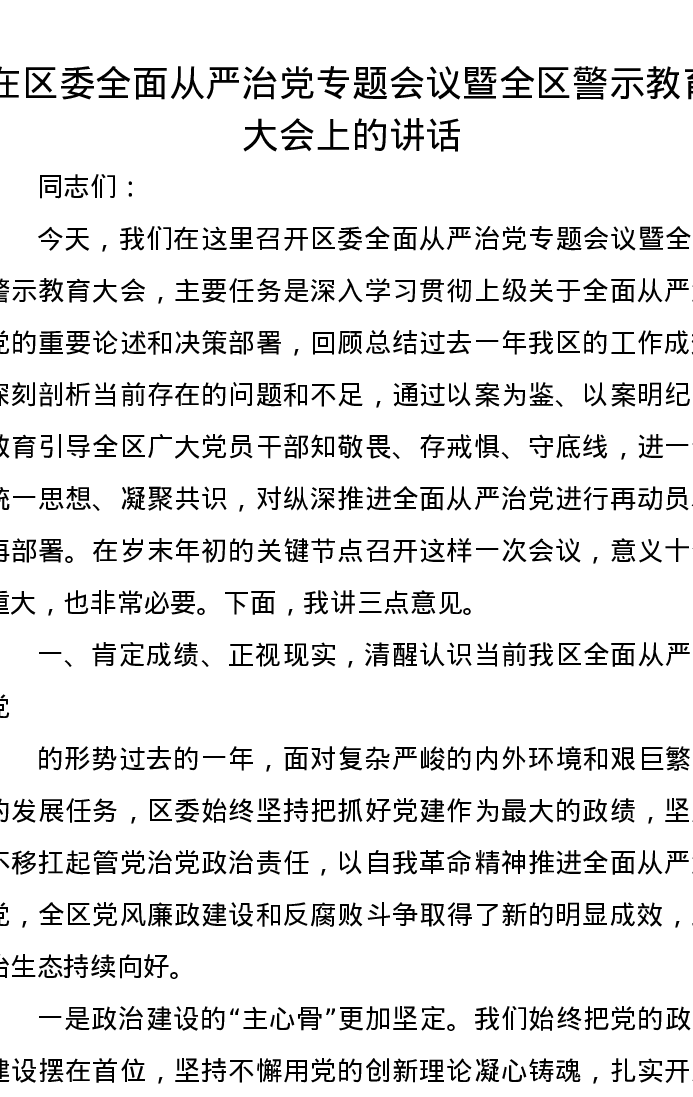 在区委全面从严治党专题会议暨全区警示教育大会上的讲话