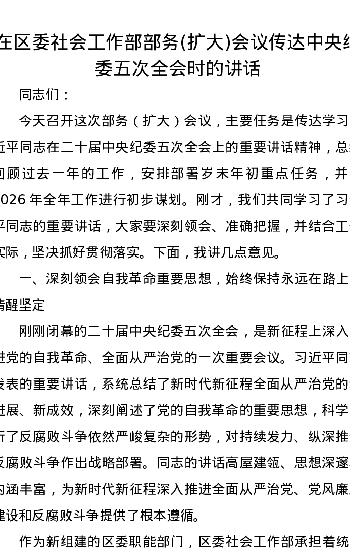 在区委社会工作部部务(扩大)会议传达中央纪委五次全会时的讲话