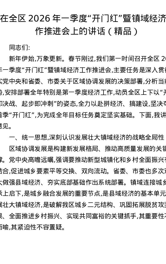 在全区2026年一季度开门红暨镇域经济工作推进会上的讲话