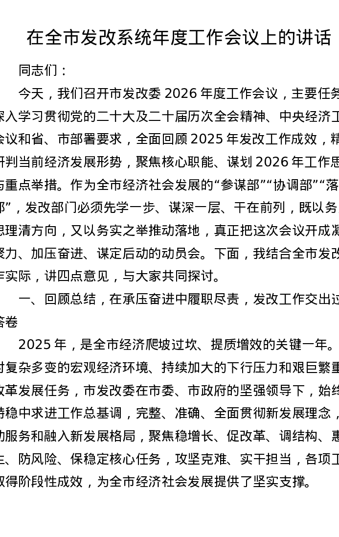 在全市发改系统年度工作会议上的讲话