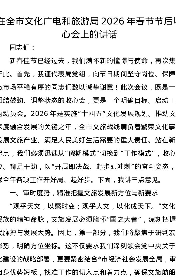 在全市文化广电和旅游局2026年春节节后收心会上的讲话