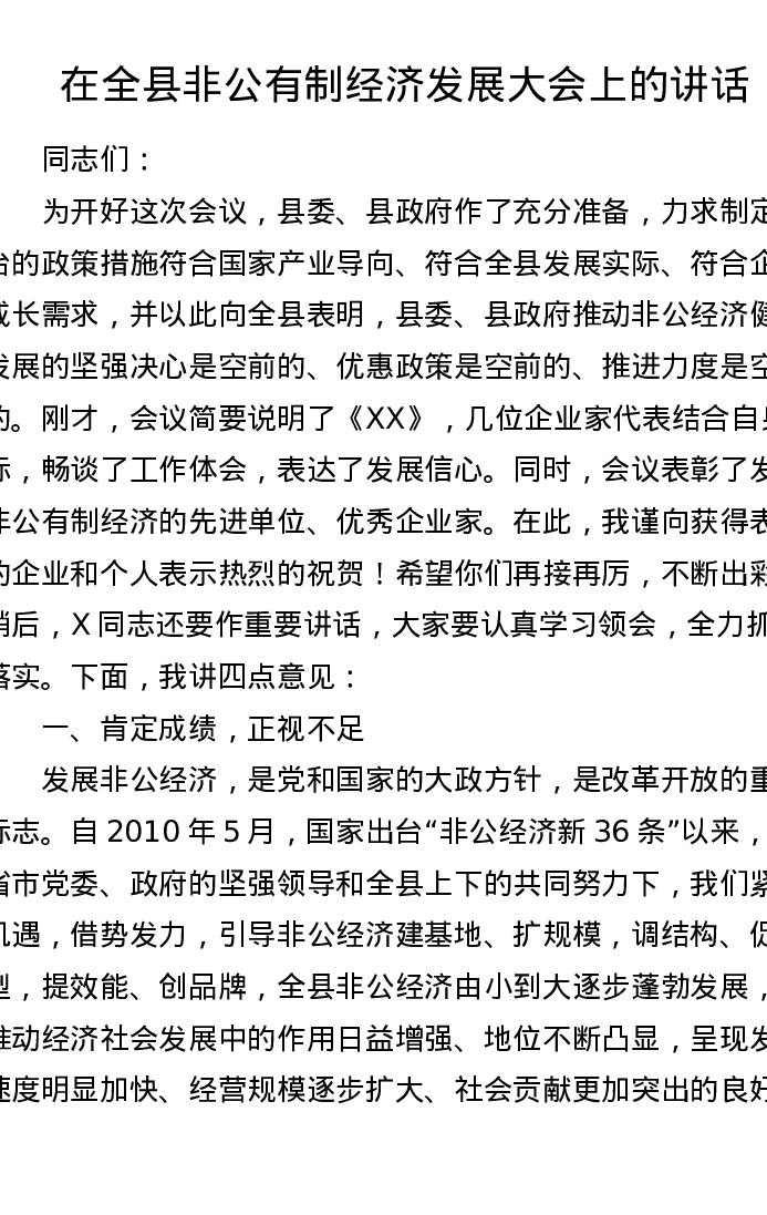 在全县非公有制经济发展大会上的讲话