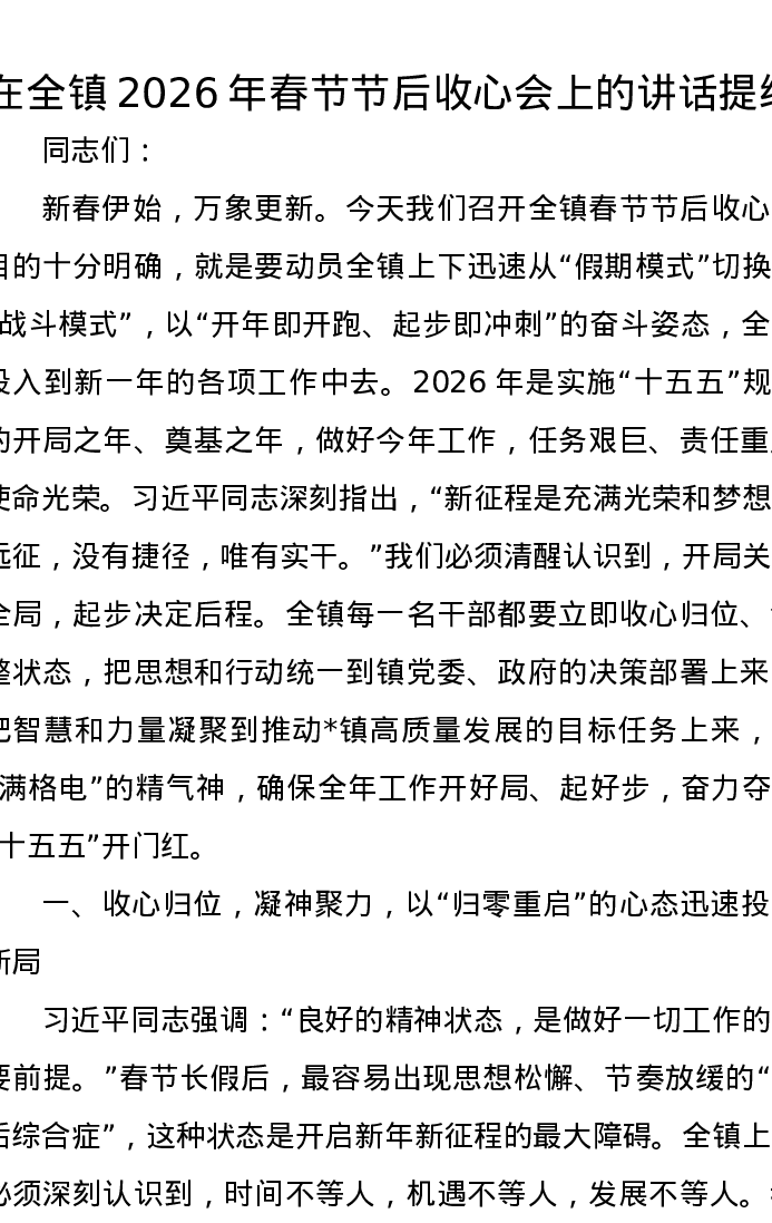 在全镇2026年春节节后收心会上的讲话提纲