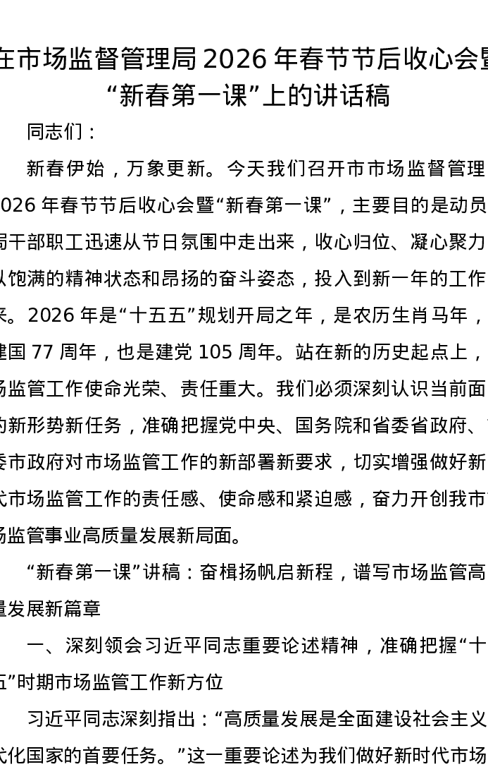 在市场监督管理局2026年春节节后收心会暨新春第一课上的讲话稿