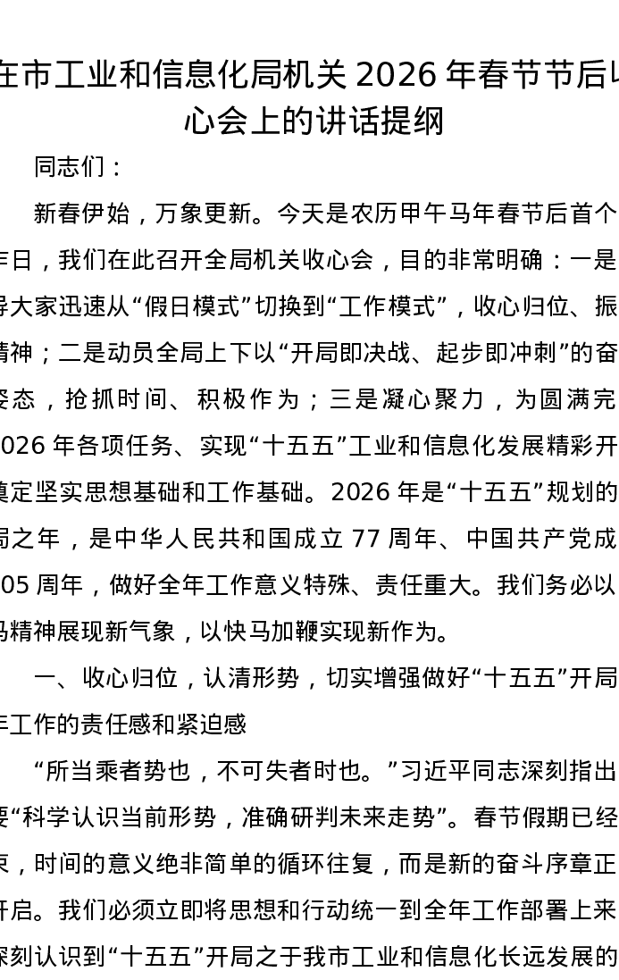 在市工业和信息化局机关2026年春节节后收心会上的讲话提纲
