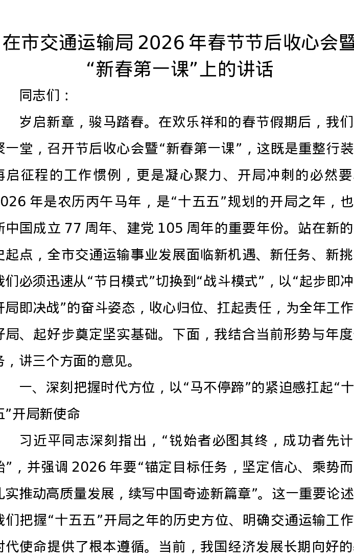 在市交通运输局2026年春节节后收心会暨新春第一课上的讲话
