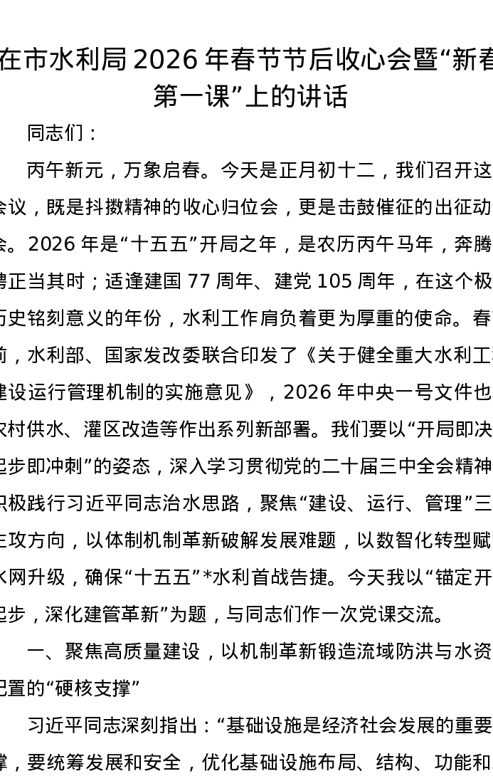 在市水利局2026年春节节后收心会暨新春第一课上的讲话