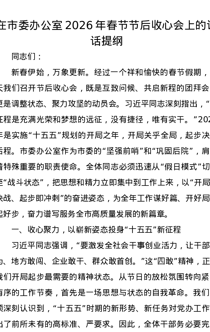 在市委办公室2026年春节节后收心会上的讲话提纲