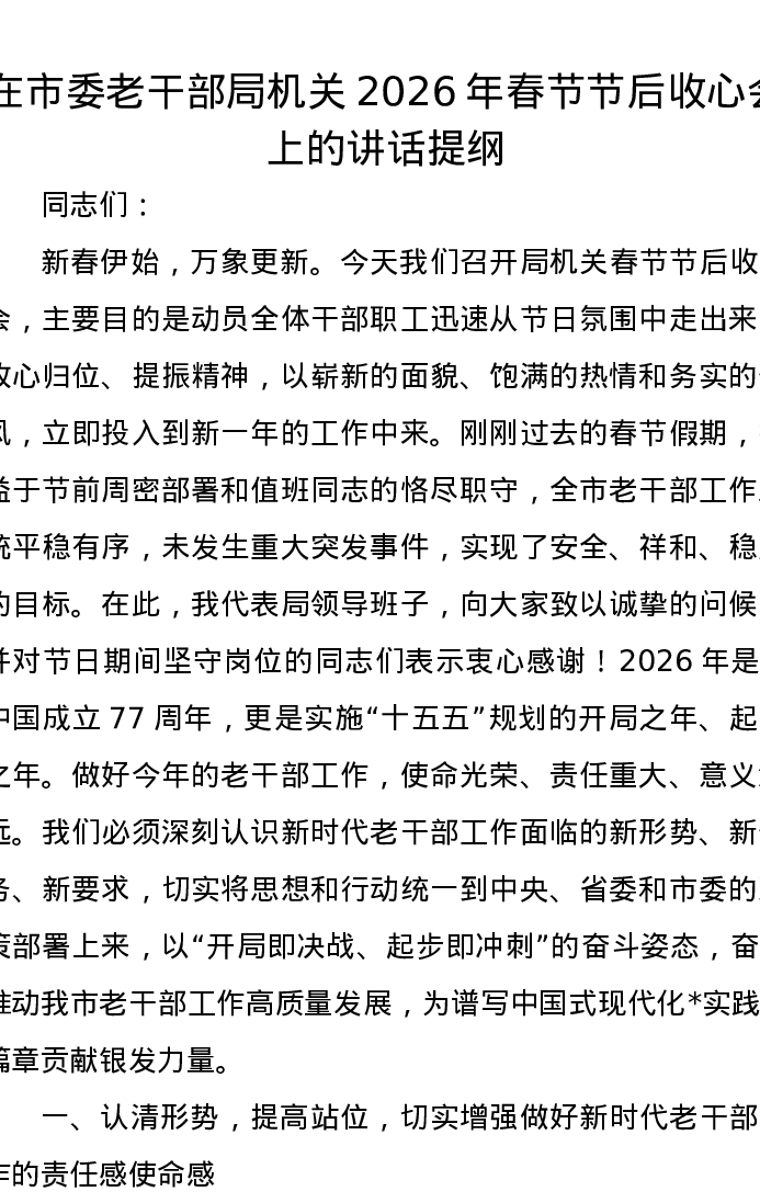 在市委老干部局机关2026年春节节后收心会上的讲话提纲