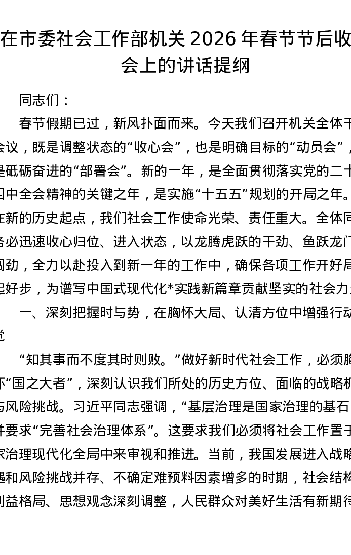 在市委社会工作部机关2026年春节节后收心会上的讲话提纲