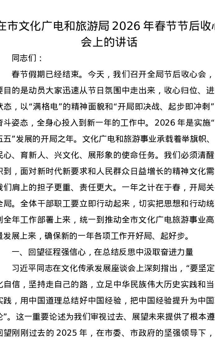 在市文化广电和旅游局2026年春节节后收心会上的讲话